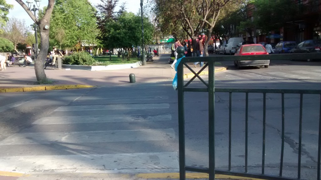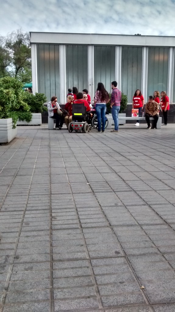 Pese a lo anterior, a los furiosos ciclistas y a la guerra a los automóviles, donde uno no sabe qué vehículo usar para poder moverse en esta urbe, se notan los avances y la mentalidad distinta a provincia. Es un agrado caminar un día domingo por las calles tranquilas de la ciudad y tener rebajes de veredas, o poder ir a tomarse un cafecito a un local que tiene una rampa. O mejor aún, ir a la universidad o hacer trámites y poder hacerlo de forma autónoma. Ya se ven muchas personas con bastones o sillas de rueda por las calles, de diversas comunas. Y no es que acá hayan más personas con discapacidad, sino que tienen más opciones de salir, como en esta foto que saqué en la plaza de maipú.